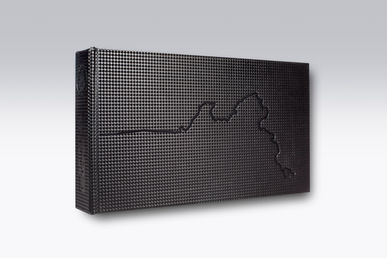 Artefacto fotovoltaico en silicio amorfo flexible de tono carmesí, con mecanismo de extracción automatizado por rieles y trabajo de orfebrería en cobre. Libro encuadernado y cosido a mano con escartivanas, cubierto en reproducción de carbono troquelado. 80 páginas y 30 hojas trípticas, reproducidas en Gliclée, con pigmentos minerales encapsulados sobre papel FineArt Hahnemühle Photo Rag Duo 220 gr. Su durabilidad estimada es superior a 150 años en condiciones óptimas de conservación.